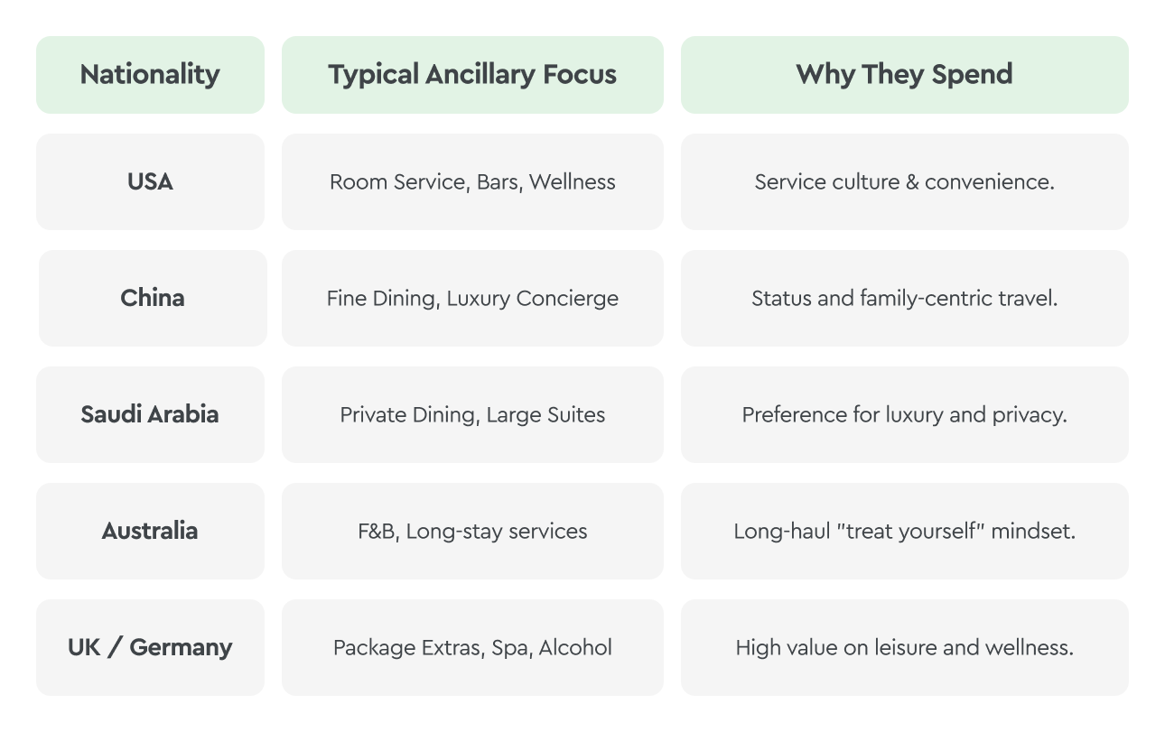 - Pushing specific room packages including F&B or Spa discounts to these nationalities, knowing they are statistically more likely to use them.